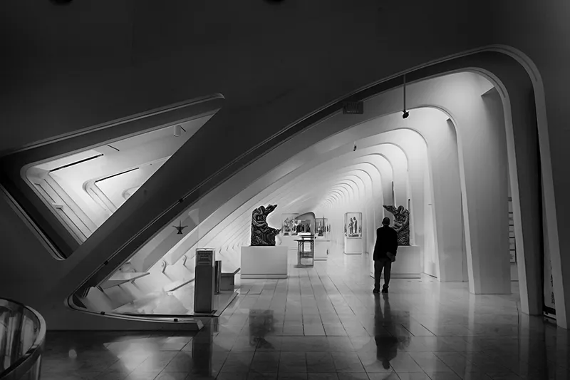 A lone spectator reflects on art displays at the Milwaukee Art Museum.