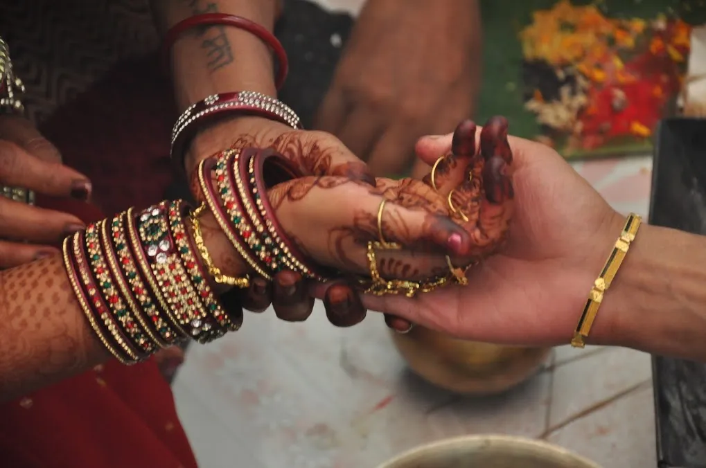 The colour RED and heavy ornaments defines a traditional Indian married women, even her feet and toe talks the same story.