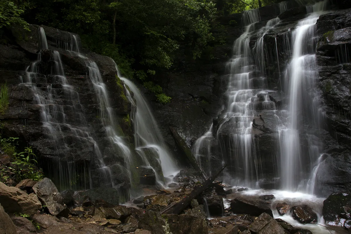 Spring waters flow over the beautiful double Soco Waterfall in western North Carolina.