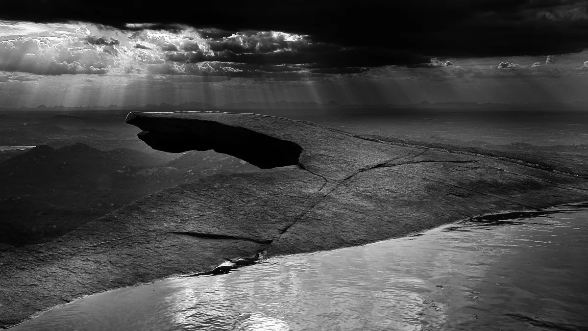 This surreal frame was taken at the edge of a mountain top a little before sunset at Avalabetta, a little known hilltop near Bangalore. The rolling hillocks and the large strips of greenery in the distance formed the hazy outline of a distant backdrop against a spectacular ledge. The golden sunrays added to the drama giving the ledge and this image a silver lining.