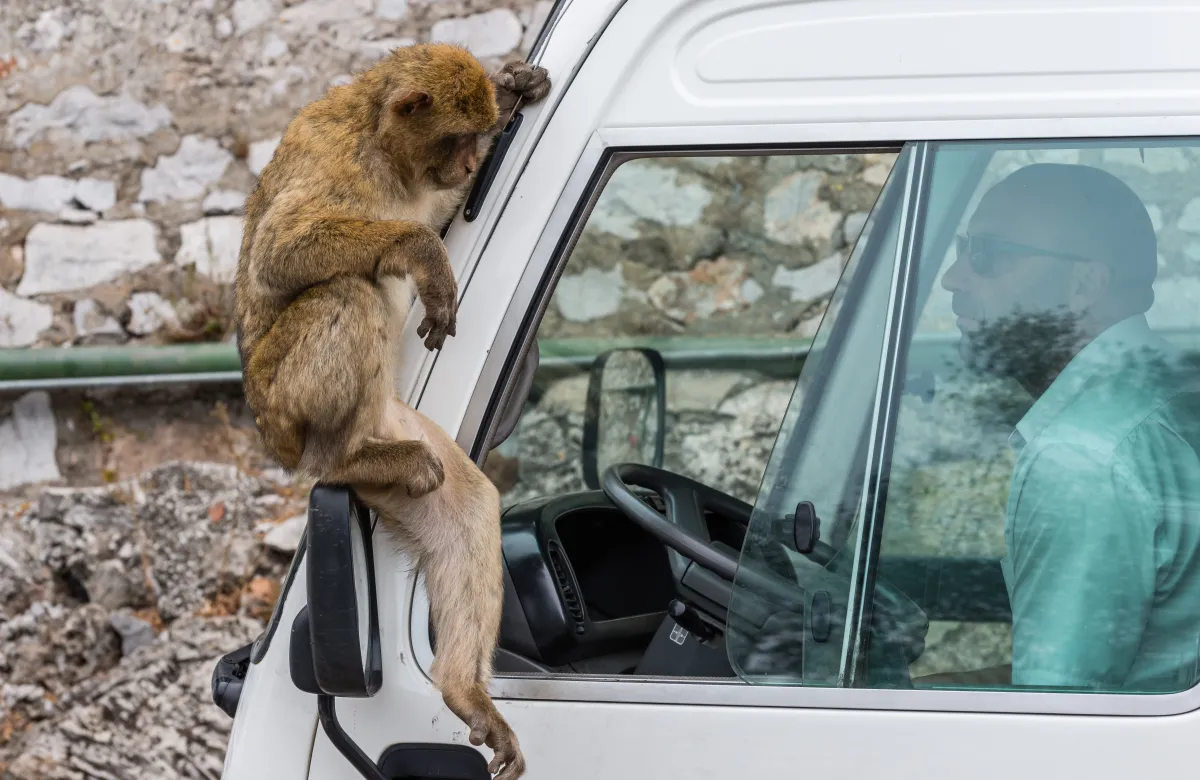 Gibraltar, Interaction between people and animals. It seems as if the monkey demands a payment for passage.