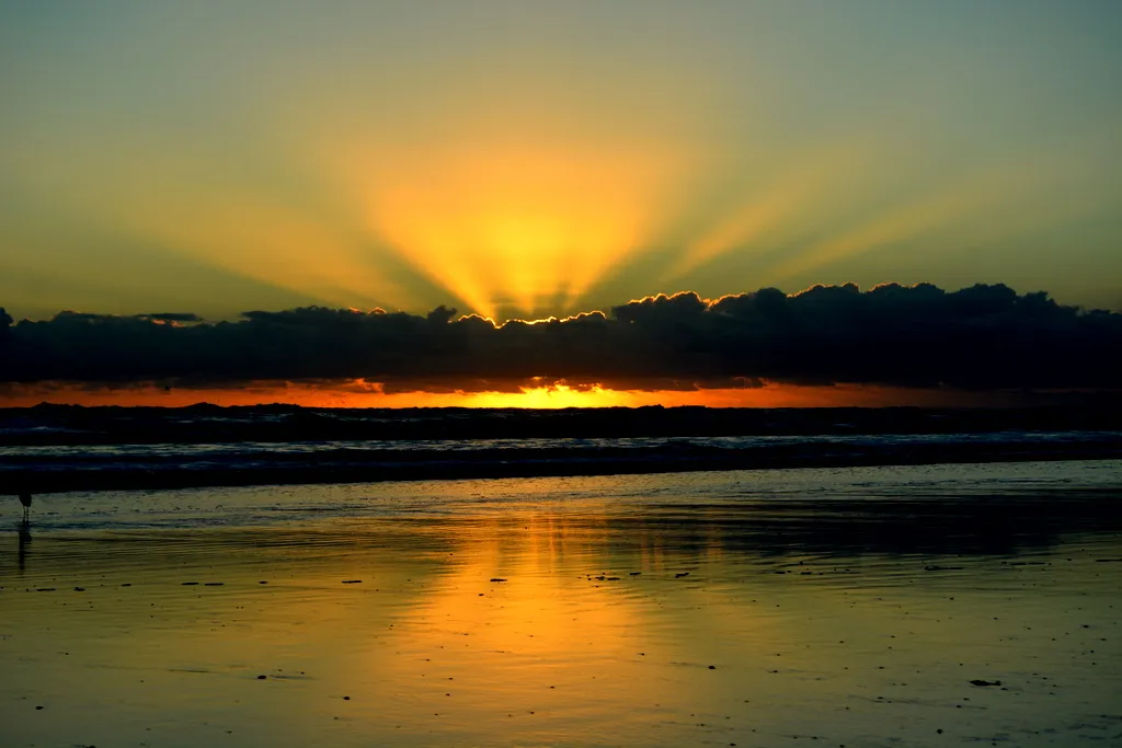 The sun was setting behind clouds and then peeked through just before it went below the horizon. The long exposure gives the ocean a ghost like feel completing the picture