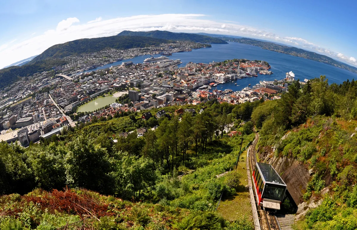 Spectacular views of Bergen, Norway, the surrounding fjord and mountain landscape can be seen from the top of Mt.Floyen. The top of the mountain can be reached by funicular, one of Bergen's best known attractions. Using my fisheye lens and a Nikon D90, I photographed wide angle views with a hemispherical effect. I knew I captured that unique image when I included the red colored funicular in the foreground of my picture.