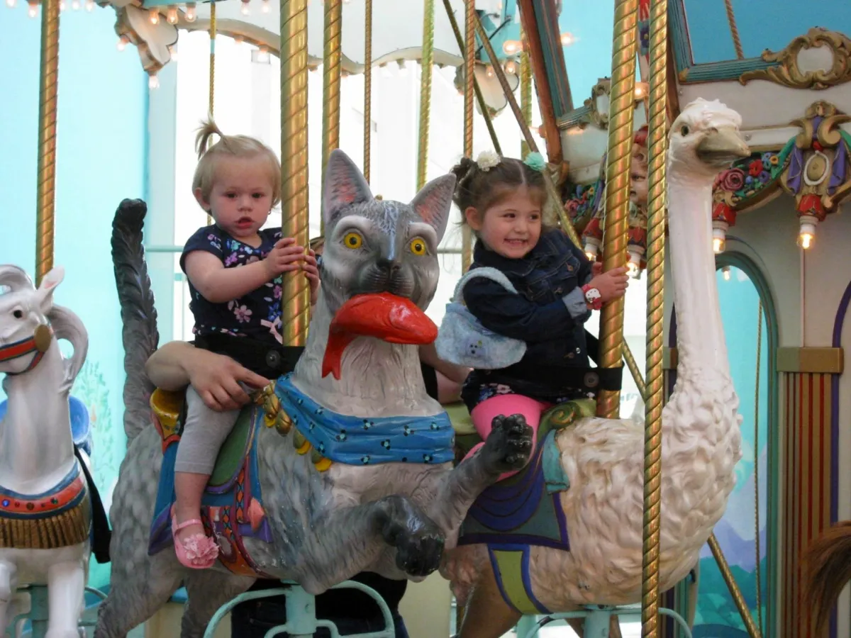 Love watching the 2 granddaughters having fun together.Taken May 2015 in Sacramento,California Both riding the carousel beside each other.