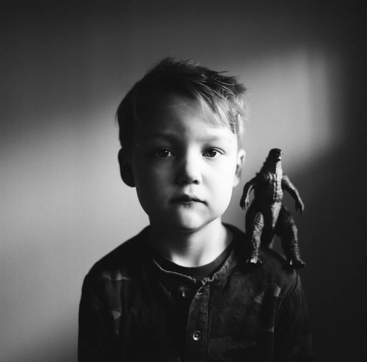 Portrait photography is a passion. Staging mini sessions with my son is one of my favorite pastimes. I had an idea to use his Godzilla doll, slight widow blind crack, and my Rollei SL66SE loaded with 400TX Kodak film.
