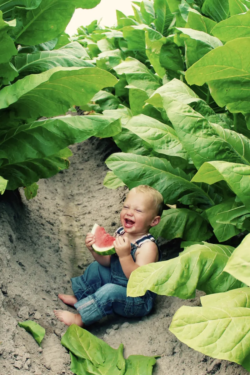 This little farmer had to take a quick break in the field to enjoy his favorite food and to remind us that laughter is good for the soul.