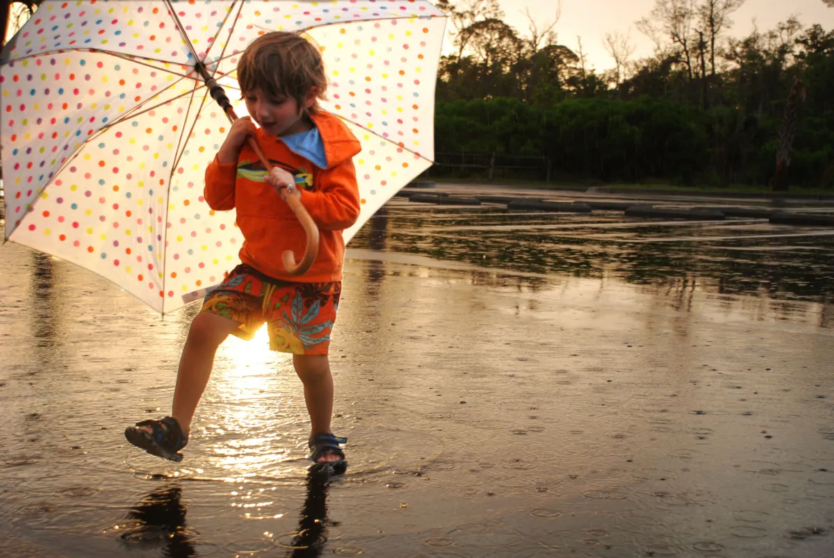 my son loves to"puddle jump"and I was lucky to capture this moment without getting my camera all wet. He took my umbrella to run and jump in the rain as we were leaving the park it was a very light drizzle at that time and I got this shot as the sunset behind him. taken in Gulf Breeze, Florida.