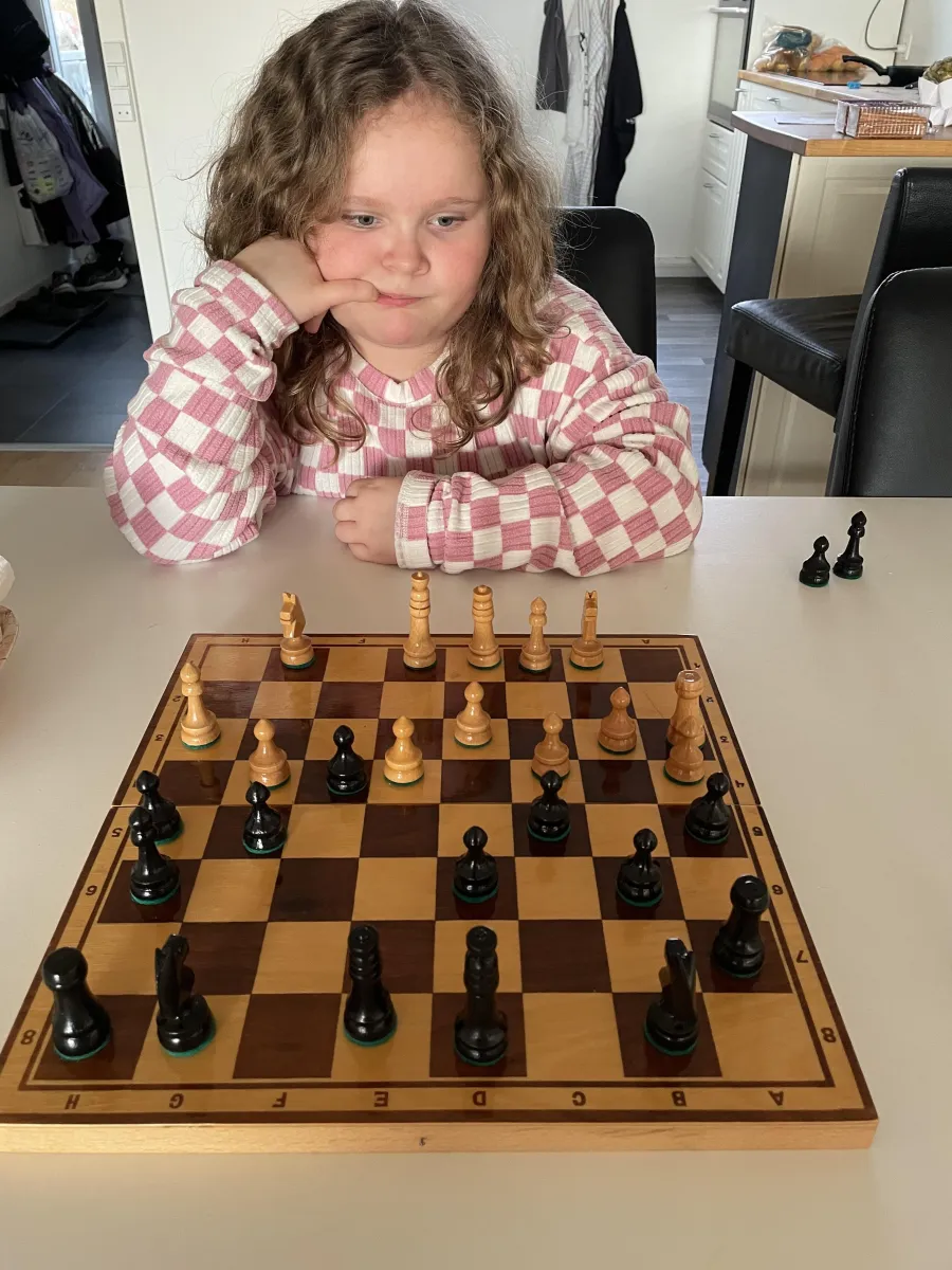 My daughter and I, haveing family time after school. She wanted to play chess, but had to teach me the rules first. 😉
