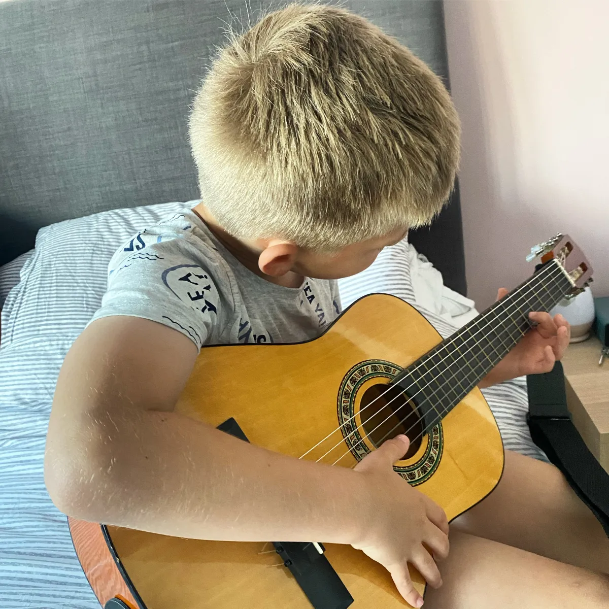 Noah’s just started learning to play the guitar, so he’ll seize any opportunity to pick it up and have a play, even if it means delaying bedtime 😉