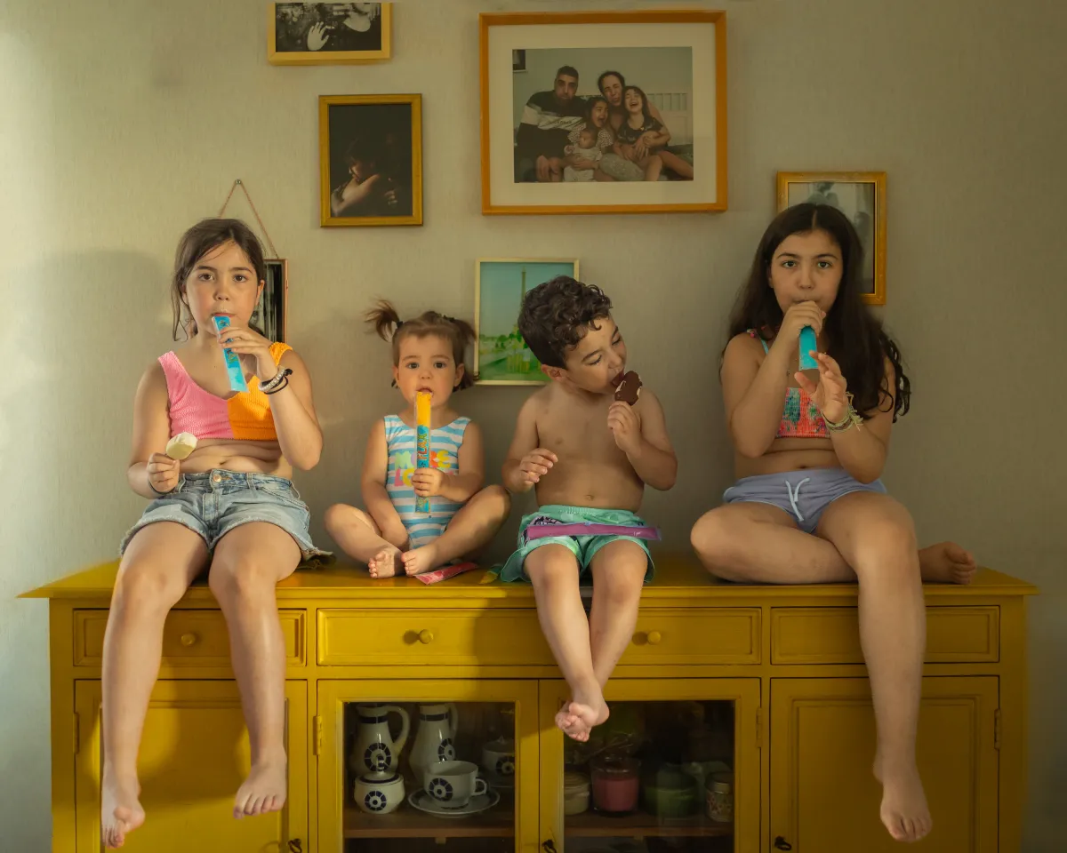 After a long mild winter, first summer days are here. I wanted a portrait of my four together, normally not easy as it is hard to keep them still. But, give them an ice cream and some popsicles and that will do the job.