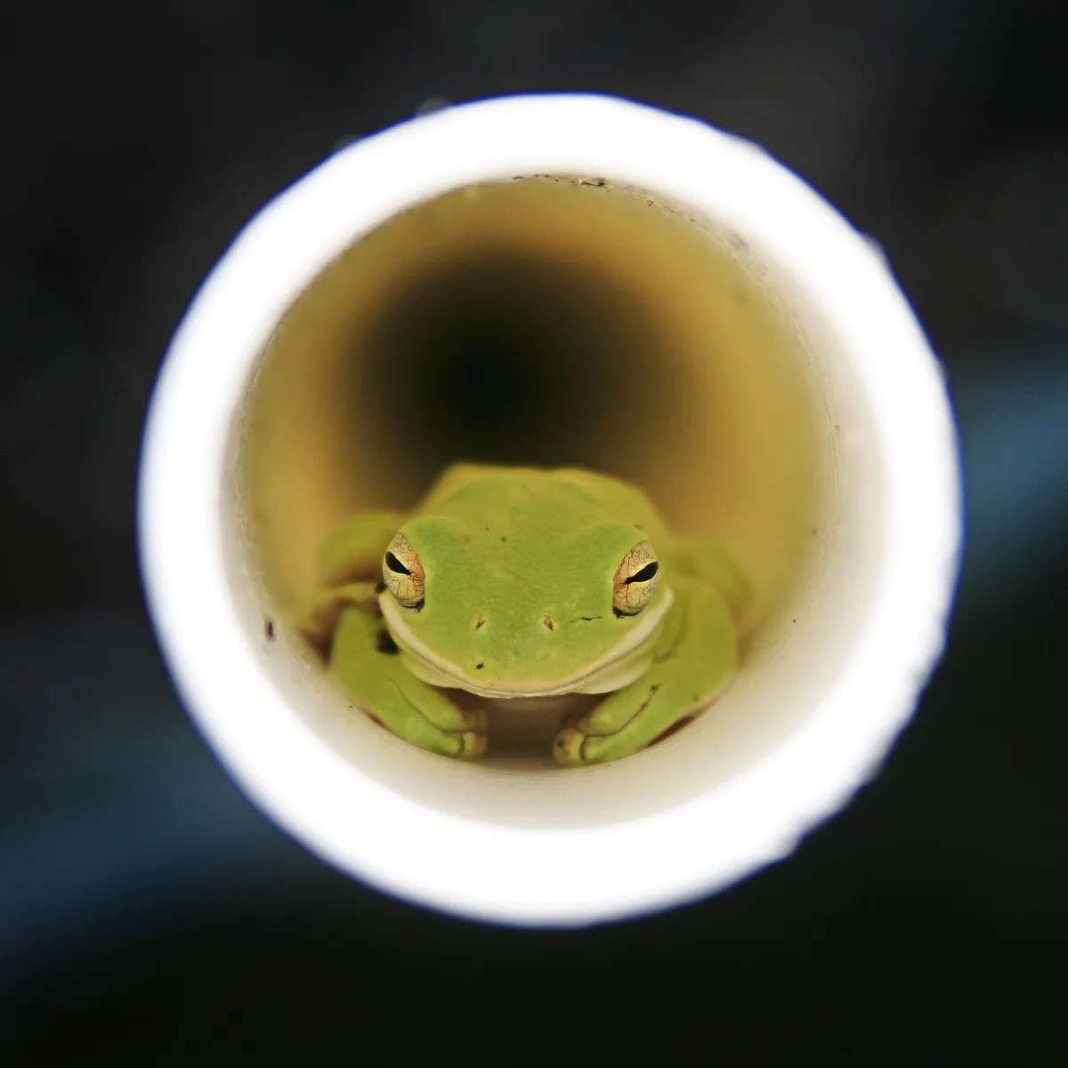 While gardening I noticed a small frog had taken shelter at the top of a small plastic pipe I used to stake a tomato. I quickly grabbed my camera and a close up filter. Wilmington, NC . Nature theme chosen for the outdoor subject matter.